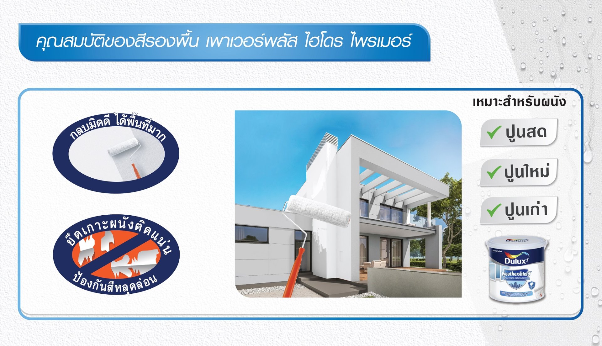 ดูลักซ์ เวเธ่อร์ชีลด์ เพาเวอร์พลัส ไฮโดร ไพร์เมอร์ สีรองพื้นปูนอเนกประสงค์ ทนความชื้น สูตรน้ำ เกรดซุบเปอร์ พรีเมี่ยม สำหรับปูนฉาบเสร็จใหม่และปูนเก่าสภาพดี นวัตกรรมใหม่จากดูลักซ์เพื่อระบบการปกป้องผนังและสีทับหน้า ด้วยสีรองพื้นปูนอเนกประสงค์ทนความชื้นสูตรน้ำ ดูลักซ์ เวเธ่อร์ชีลด์ เพาเวอร์พลัส ไฮโดร ไพร์เมอร์ เป็นสีรองพื้นปูนอเนกประสงค์ที่สามารถทนความชื้นสูงสุด 40% สามารถทาบนพื้นผิวปูนที่เพิ่งฉาบเสร็จใน 2 วัน